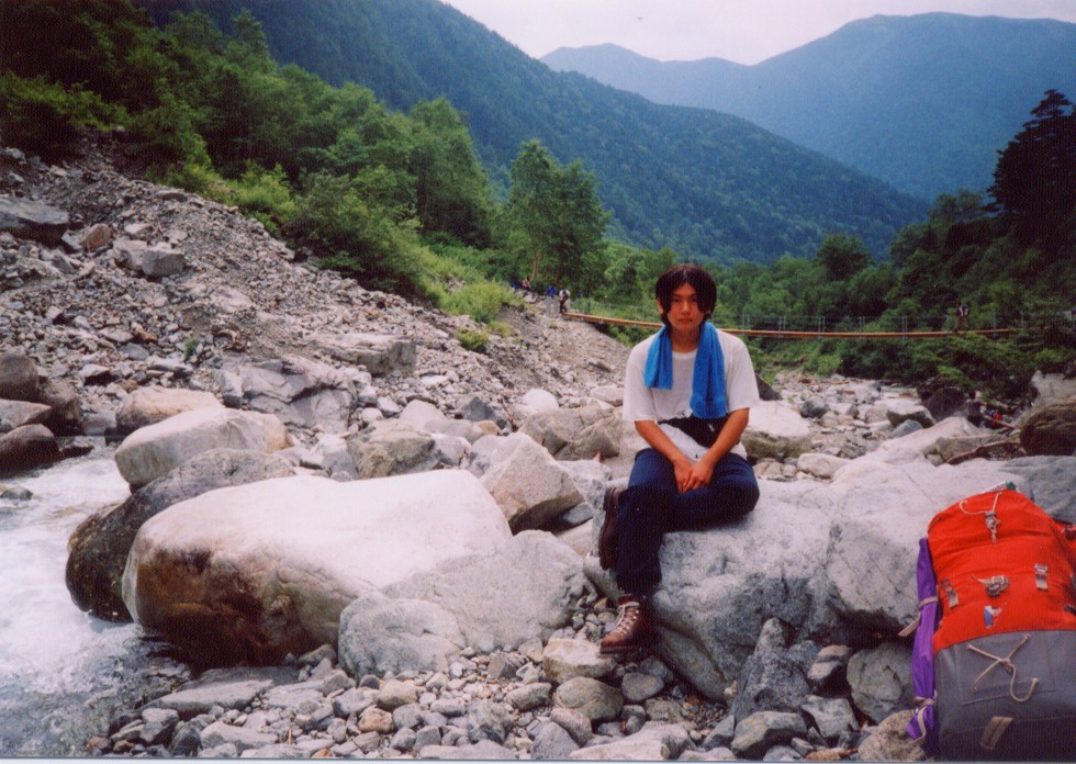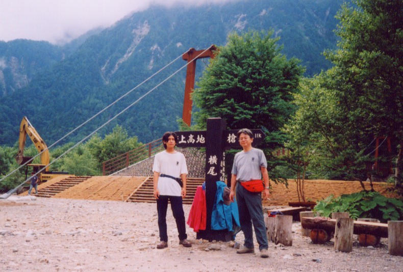 奥穂高岳山頂にて。右の写真は携帯電話使用中。2000.8.8撮影