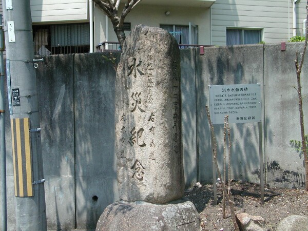 昭和十三年七月五日と読める。碑の下の基礎石に横線が刻まれているが、当時の洪水水位を示している。