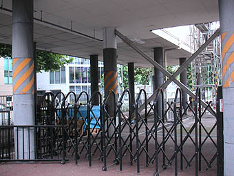 | 閉館して約3ヶ月後の交通博物館です、まだ玄関には照明も点き囲われてはいますが玄関横の0系新幹線とD51型正気機関車の先頭部は保管され姿を見ることが出来ます。 あの独特な階段部分の窓もまだ健在、本館内にはまだC57-135号機やシミュレーターなどがひっそりと置かれていると思われます。 |