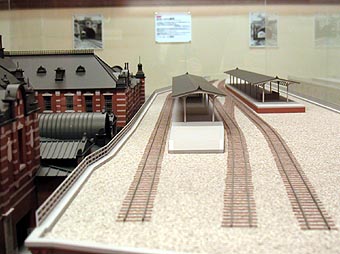 | 博物館内に特設展示されていた開業当時の万世橋駅の模型、現在の東京駅をイメージさせる作りです、右は同じくプラットホームの模型・・真ん中のホームが現在残っているホームではないかと思われます。 | |