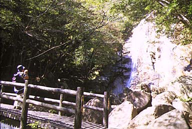 深い杉林の中、巨石が並ぶ清流に落ちる高さは50mの名漠。