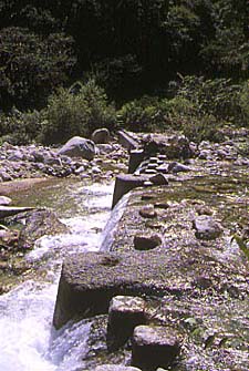 右端の写真は東海自然歩道で、橋の代わり石の上を歩いて渡る。増水時は通行禁止。