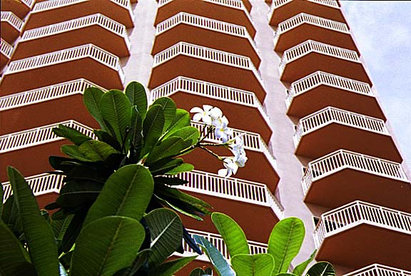 ”ブルメリア”は南国でお馴染みの花で、レイを作るのによく使われる。甘い香りがするのも特徴。 グアムでは到る所に見受けられ、この写真もタモンビーチに立ち並んだ某ホテルをバックにパチリ!(^^)
