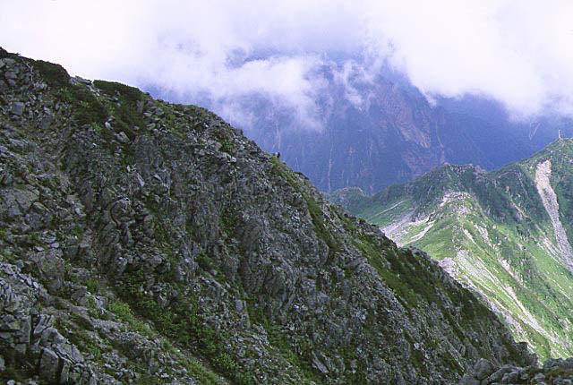 真ん中あたりに人が登っているのが見えると思います。実はこの写真前日南岳山頂から撮ったもので、翌日の偵察を兼ねた一枚でした。(^ ^ゞ ポリポリ この岩場を下ったところから左にルートを取れば氷河公園に行きます。
