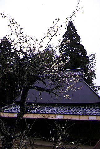 農家の庭先に咲く梅の花。その枝振りは見事であった。