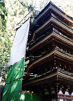 国宝で、頂上の相輪(普通は水煙が多い)も半分に折れ曲がった状態であった。