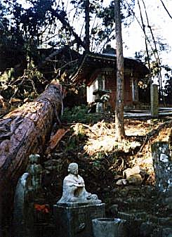 その真横に大きな大木が倒木し、後ろの小堂の屋根も損傷を受けていた。