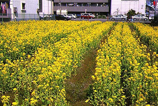 大阪は吹田市江坂のビル街の一角にも、このような春を告げる菜の花畑がありました。(^^)