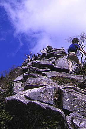 ミ〜ヨンさんが、ここでリタイアー!この先に、グラクラした大岩が今にも落ちそうな様子に一瞬たじろぐ。勿論この場所には鎖が無い。この岩を乗り越えなければ、その先に進めないのだ。かなり危険な個所には間違いない。