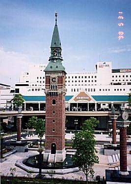 チボリ公園より倉敷JR駅を望む。シンボル塔を中心に立体歩道橋が設置。