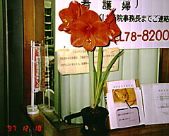 薬局の前に置いた鉢植え(水耕栽培?)のアマリリスが咲き始め、患者さんたちの目を引いています。全部で5輪もの大きな赤い花が開きました。