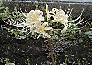 続いて咲いたリコリスは、アルビフローラ(シロバナマンジュシャゲ)でした。6年前にも植えたけど咲かず、今年植えたのが、初めて開花しました。薄い黄色に赤い色が混じり、両親(黄色のヒガンバナと赤のヒガンバナ)の色が出てしまっています。