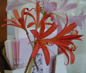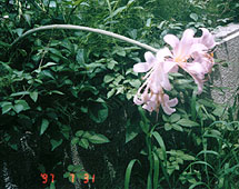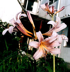 謎のリコリスは、やはりナツズイセンでした。5年前に植えたもので、咲いたのは3年ぶり2度目です。前回は7月末に咲きましたが、学生時代薬草園で、お盆の頃に見た事があります。何とも言われぬ妖しい花の色なので、切り花にして薬局の前に飾りました。