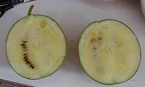 職場の花壇に植えていた小玉スイカを収穫しました。数日前より、大きさが変わらなくなり、軽くたたくと澄んだ音が聞こえるようになっていました。ハサミで切り取り手に取ると、小さいながらもズッシリと重みが 感じられます。ナイフを入れると、パカっと亀裂が走り、中から黄色い果肉が出てきました。スイカの甘い香りが、薬局いっぱいに漂います。よく冷やしてからかぶりつくと、これがまた旨い! 小玉スイカの黄色い果肉に、遠い夏休みが甦りました。思えば中学3年の時、スイカの栽培に失敗して以来、実に25年ぶりの快挙です。