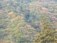 県道と合流すると、いくつかの坂を越え、やがて「初花の滝」と書かれた石碑がありました。右側を見ると、少し開けたところから正面に滝が、見えました。かなり遠いため、デジカメではほんのわずか写っているだけですが、木々の間に見え隠れする白い水の筋は、一見の価値あり、といった感じです。 |