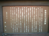 東海道は、しばらく繁華街の中を進むと、やがて静かな住宅地になります。大通りが平行していることもあって、車も少なく、比較的歩きやすい状態です。次第に太陽の光が弱くなってきて、旅人の足を早めます。しばらく旧道を歩くと、やがて右側に平行していた県道と合流します(左上)。合流地点には交番があり、その前には川会所跡を示す案内板があります(写真右上)。交番の後には小さな公園があり、冠木門跡の案内板(写真左下)、由比正雪の墓跡といった史跡がありました。 公園の近く、安倍川橋梁の手前には、名物安倍川餅を売っている石部屋があります(写真右下)。ここでは手作りの安倍川餅を買うことができます。この日は時間的にも遅くなっていたので、先を急ぎました。 なお、石部屋の隣には、「安倍川義夫の碑」が建っていました。 |
