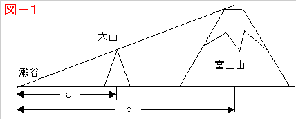 ちょうど 図−1 のような状況となると想像される訳で、これを証明するには地図上で 図−1 の a、b の距離を図り、a : b の比が 「大山の高さ」 : 「富士山の高さ」 の比と同じになれば良い ということになるのである。