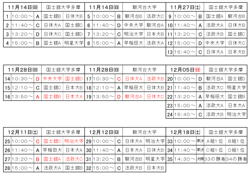 男子:11月14日~12月18日 会場=国士舘大学多摩キャンパス、駿河台大学