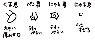 A4.以下の図のようになります。ペン君はクチバシが邪魔な為、うつ伏せには眠れません。クッキー君はたまにうつ伏せに寝る習性もあります。にゃも君にゃま君は仲良く籠のふちにクチバシ、お口をのせて並べてあげると喜んで静かに眠ります。アジャは無理をしてそっくりかえる元気な子です。なぜ、そこまでして寝るのかはゆっこにもわかりません。身体がちっちゃいのできっと負けん気が強いのでしょう。くま君は真横に寝ます。ただし、にゃも君にゃま君と同じ籠に眠る場合はにゃも君にゃま君の上に乗っかります。にゃま君達は、くま君が上に乗ろうが乗らまいが、二人仲良く並んでいれば満足なようです。