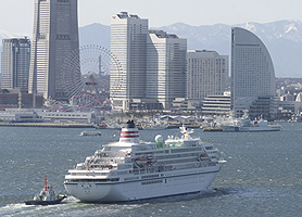 B右の写真は、横浜港を入航する客船飛鳥と、みなとみらいのビル群。 一番高いのがもちろんランドマークタワー(横浜ロイヤルパークホテル) →