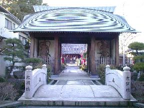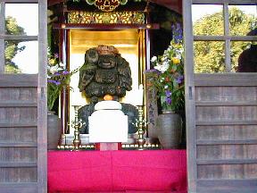 中原区小杉御殿町1−906 大楽院から新丸子駅を過ぎ20〜30分歩いて、等々力緑地の手前です。参道の入口には徳川将軍御殿跡(ようするに宿泊地跡)の石柱があり、約200mの参道を歩いていき、ふたつの山門をくぐると、広い境内の右手に梵鐘、正面に本堂がうかがえます。大黒様は、本堂に奉られています。寺務所は本堂の右側にあるので、この寺務所で御朱印をいただきます。 |