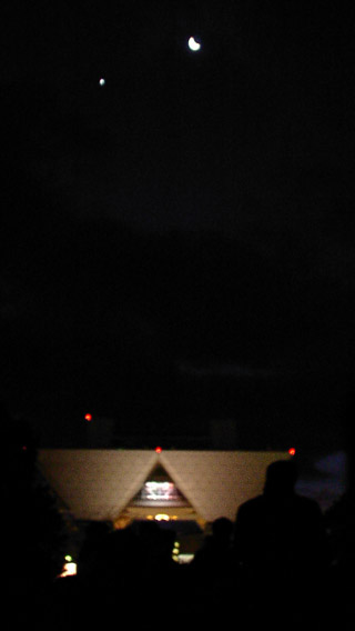 列に並んで着席。ビッグサイトの真上に月と星が出ている。朝食に買っておいたパンを食べたが、かなり悲惨なことになっていた。