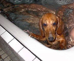 どうです? 水も滴るいい男でしょ? アッシはいまのところ、2周間に1ぺん、たーころ宿六さんと こうやって一風呂浴びるんです。 初めての時は、そりゃぁビビリやした。 泡だらけにされて、シャワーっていう物で、頭からお湯を浴びせられて、 もう、この世の終わりかと思いやしたもんです。 でも今じゃぁ、こうやって余裕なもんです。 あ、でもたまに足が着かなくて溺れそうになっちまいやすがね。
