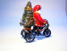 自転車に乗ってサンタさんが プレゼントを持ってきてくれる! ツリーが落ちないように押さえてるから 片手運転なのです。 落っこちないようにツリーにテディが しがみ付いているのがわかりますか? |