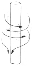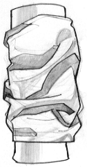 まず最初に2本の線を横に平行に5センチ間隔で12から15センぐらいの線を横にひく。そしたらの左の図を見てね 最初に引いた線を基に、。先にシワの流れを描くよで反るシワを一本だけ加えてみよう。上左の図で言ったら4.番のシワになるね。 そしたら左下の図を参考にシワをつくって描いてみよう。 初心者の人、大丈夫だよ、きっと上手く描けるから、安心しよう。 よく見て書き写してみて、ゆっくりゆっくりだよ。 4.番のシワがポイントね。