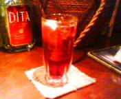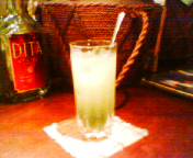 ↑GO-YA(ゴーヤ、ヒラミレモン、泡盛) 細かくくだいたゴーヤ沈殿、スプーンで混ぜながら。超苦いけどゆっくり飲むにはいい