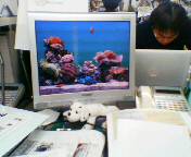 ↑学研ゲットナビの清水さんの机。NECの「3Dアクアリウム」をダウンロードしたといって喜んでいた。でもこれ本当によくできている。パソコンがリアルな水族館になる。ちなみにNECのパソコン買うとおまけで入っている。けど製品は1500円。