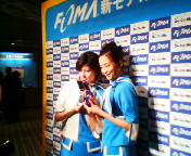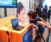 ↑FOMA発表会。CMキャラの坂口憲二登場?と思いきや、ビデオで出演。カンペ読み過ぎ。写真(中)はF2402を使ったテレビ電話、右は海外dで使えるGSM携帯。