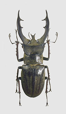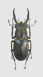 ルニフェルミヤマクワガタとかルニファミヤマクワガタなど、と呼ばれることが多い。北インドから、ネパール、ブータン、あたりに分布している。♂は最大で80mmを超え、頭部から胸部、上羽根にかけて金色の微毛が目立つが、活動するとすぐに擦れてとれてしまうのかそのまま綺麗に残る個体をみる事は意外に少ない。特に上羽根の微毛。 |