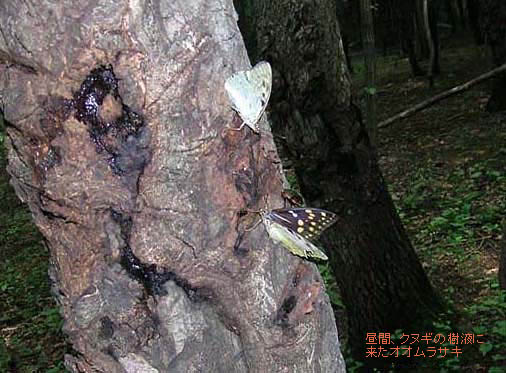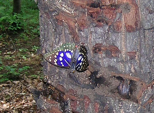上に居るのが雄です。なんと後から雌がやって来て雄を威嚇し、樹液の良く出ている場所を独占しようとしました。オオムラサキは樹液をめぐって、よくカナブンや蜂などと争う勇猛さも有る蝶で、バサバサと羽音を立てて素早く飛ぶ姿は日本の蝶の中でも最も力強いものです。