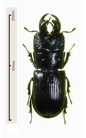 体は黒く艶があり、最大体長は20mm程度。大きいものだと前胸背板が前方から後方に向かい幅が狭まるのが顕著になる。写真の標本はオハイオ州産。