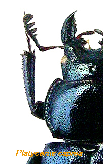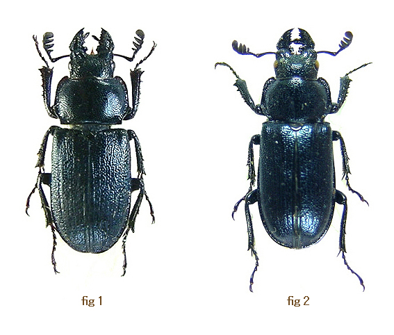 ヨーロッパ産のこの属も以前よりぼちぼちと集まり未展足の標本が溜まって来ていた。ある日や っと展足整理をしてみる気になり重い腰を上げたのだが、あらためてじっくり眺めるとヨーロッ パのルリは日本産とは又違った雰囲気を持っている結構良い虫ではないか!! 俄然興味が沸いて 来た。集まった標本にはきちっと同定ラベルの付いたものも有るが、中には同定されているもの の、どう見ても誤同定ではないかと思えるものもある。疑問が出ると興味は更に強くなり、そこ でこれらについて資料や情報を集めてみようと思い立った。 近年インターネットの普及で海外の研究者や採集者から直接標本や資料を手に入れる事も出来た り、素人にもなかなか便利な時代になったのだが、文献を捜すのは予想以上に時間が掛かってし まった。手に入っても当然ながらそれぞれの国の言語で書いたものが殆どで、言葉の壁も立ちは だかっている。 今回まだ十分ではないのだが現在まで調べる事の出来た資料から、知り得た事と幾つかの地域か ら来た標本の紹介として書いてみた。ほんの少しでもヨーロッパ産ルリクワガタの魅力を感じて もらえたら幸いである。 また期せずして今回のクワ馬鹿にはえいもん氏によるフランスでのヨーロッパコルリクワガタ採 集の記事が載り、非常に興味を持った。最近フィルドワークの乏しい (当然ヨーロッパで採集し た事は無いです) 自分としては、今後の期待が大である。 ルリクワガタの仲間は北半球の主な大陸と一部の大陸島に広く分布しているが、 ヨーロッパで見られる代表的な種としては、Platycerus caraboides (Linnaeus, 1758) カラボイデスとPlatycerus caprea (DeGeer, 1774) カプレアがよく知られて いる。この2種は非常に近い種で酷似しており分布が重なる地域も多く、今までしばしば混同さ れて来た事は否めないようで、この点を指摘する最近の文献も有る。 両種の形態からの区別は前胸背板と頭部のカタチとそれらに有る点刻の相違、更に脚や交尾器の 違いなどに及んでいるが、なにせ小さい種、頭部や前胸背板の点刻に関してはかなり拡大して見 る事が必要になる。ちなみにカプレアは若干点刻が少なくカラボイデスの方が密で、これは雄 雌とも同様である。 更に個体によっては微妙な違いでなかなか難しいものも有る。       ![]() 雄のサイズに関しては、カラボイデス8-13mm、カプレア10-15mm程度としてある文献が多く、 カプレアの方が平均的に大きいようだ。 幾つかの分布図(それぞれの国の)によるとこの2種は平地から標高1000mを超えた山地まで棲息し ていることが判るが、やはり小さい島には分布しないようだ。地中海に浮かぶかなり大きなコル シカ島、サルディニア島、シチリア島に於いても発見された記録が載る文献や標本をまだ知らな い。 ヨーロッパのルリクワガタは、ヨーロッパミヤマと同様に古くより多くの種名や亜種名が記載さ れその数は優に20を超えている。現在それらは同一の種に異なる種名(シノニム)がつけられたと して扱われるものが殆どのようだが、更に研究整理の進むことが望まれる。何しろ広範囲に分布 している系統だけに少し変わったのがいてもおかしくない。 今回、この2種のほかにイベリア半島からの種とコーカサス地方からは2種。そのほか中央ロシア 、シベリア、あたりまで含む地域のものを載せてみた。 Platycerus caraboides (Linnaeus, 1758) カラボイデス (ヨーロッパ) fig-6-16 Platycerus caprea (DeGeer, 1774) カプレア (ヨーロッパ) fig-5-7-14-15-17-18 Platycerus spinifer Schaufuss, 1862 スピニファー (イベリア 半島) fig-1-2 Platycerus caucasicus Parry, 1864 コーカシクス (コーカサス地方 ) fig-11-12-13 Platycerus primigenius Weise, 1960 プリミゲニウス (コーカサス 南西部) fig-8-9-10 Platycerus pseudocaprea Paulus, 1971 プセウドカプレア (ピレネー山脈) fig-3-4 ? Platycerus oregonensis Westwood, 1844 オレゴンエンシス ( 北アメリカ) ( 上記はここで扱った種の学名ですが以降、カタカナ読みした種小名か、その後にルリクワガタ をつけて表示しています。例-カプレアルリクワガタ ) |