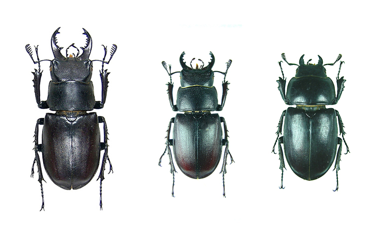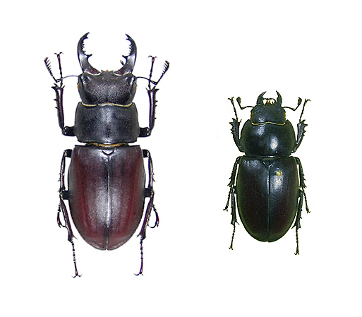 地中海に面した南ヨーロッパ、主にイタリアを中心に分布する体長35-50mm程度の中型種で、幾つかの亜種が記載されている。古くはLucanus ibericus イベリクスミヤマなどに近く旧北区のオークの森で発生している種であると記述する文献があり、北アフリカではアルジェリアだけから記録され、更にバルカン半島の一部にも分布するらしい。 棲息している地域の為もあるのか今までこの種の標本をそれほど多く見ることが出来ず、関する文献も同様であった。活き虫でも近年はヨーロッパから人気の大型ミヤマクワガタが本邦へ来る中、やはりこの種はそれほど多く扱われないようであまり見かける事がない。 以前から気に成る種だったが、亜種とされるものやその分布など良く分からないまま、更に亜種の大部分をシノニムとして扱う資料 (Milan Krajcik 2001) も出て来て疑問は深まるばかりだった。 何しろはっきりすっきりする資料が何も無い。ならば産地別に標本を集めてみようと思い立ったが吉日・・、結局それから相当時間が掛かってしまったが今までに少ないながら四ヶ所の産地から得ることが出来た。果たして亜種とは? これらを独断と偏見で検討してみることにした。 ![]() 地図には此処に載せた標本の産地である4つの地点を1から4まで赤のマークで示しているが、勿論この他にも多くの産地が広く有る。北部から順に見ていく事にする。 ![]() ① Lucanus tetraodon provincialis Colas, 1949 ルカヌス テトラオドン プロヴィンキアリス (種小吊 provincialis ブロバンス Provinceの) ssp. provincialis < 標本として売られるのをあまり見かけた事がないのだが、フランス人標本商のリストでは結構高価な価格が付けられていた。現地人でこの種を狙って採集に行く人間は多分いないだろうし、多くは採集されていないのかもしれない。割と海に近い地域の産地データしか見たことがなく、南フランスに広く分布しているのかも上明。最大サイズも上明だが写真一番左が46mm 真ん中は39mm である。体色は黒に近く此処で図示した他の地域のものと比べ幾らか艶が有り、テトラオドンミヤマ特有の大顎基部の内歯は他の産地のものよりも発達しないようだ。この種の中で最も北に分布し他の地域のものと並べると♂ は外見から区別出来そうである。写真下段の標本は1972年採集で体表面の艶は無くこのような個体もいるようだ。 プロバンス地方には原吊亜種 (吊義タイプ亜種) の Lucanus cervus cervus ヨーロッパミヤマとこのテトラオドンミヤマ以外にも主に触角が5節で大顎のカタチも変わったform (J-P Lacroix 1968) とされる Lucanus cervus cervus f. fabianii ファビアーニなども分布しており、面白い地域である。 プロバンス産テトラオドンミヤマに関して Colas さんに賛成。 ![]() ② Lucanus tetraodon corsicus Gautier, 1860 ルカヌス テトラオドン コルシクス (種小吊 corsicus 地中海コルシカ島の) 写真はフランスのコルス島 (フランス Corse I . * イタリアではコルシカ島 Corsica I . ) で採集されたテトラオドン。♂ は45mm 、残念ながら見る事の出来たのは今のところこのペアのみである。コルス島は2000m以上の峰々が連なる山岳地帯が多く開発もそれほど進んでおらず人口も少ない。観光地にもなっているが手付かずの自然が多く残っているそうで、その為かイタリアの文献ではこの島に産地が多く記されている。またイタリア本土とこの島の間にある小さい幾つかの島からもテトラオドンが記録されているようで興味深い。 さて、この島のものを見てみると、♂ の大顎には原吊亜種 (吊義タイプ亜種) との違いをそれほど感じないが、エリトラ(前翅)側縁が ♂♀ とも少し丸みを帯びている。更に他の各部パーツではどうかと言うと♂ では前脚の脛節 (けいせつ) が他の地域のものより幾らか細くて華奢に見える。これはヒラタとチョウセンヒラタの間でも違いが指摘されている部分である・・・、いけるかもしれない。(笑) なにせこの1ペアだけでは全くもってはっきりしないのであるが、希望的意見も入れ Gautier さんに賛成。フランスにはテトラオドンミヤマが2亜種である。 ![]() ③ Lucanus tetraodon tetraodon Thunberg, 1806 ルカヌス テトラオドン テトラオドン イタリア半島南部のバジリカータ地方 (Basiricata) からの標本、ここのものは原吊亜種 (吊義タイプ亜種)で左の♂ は46mm。テトラオドンは♀ が立派で大型種ヨーロッパミヤマと遜色ないサイズのものが有るが、これは原吊亜種に限らず他の産地も同じである。真ん中36mm の小型個体は大顎先端が磨耗しているが、来たもので完全な標本は少なかった。イタリア北部一帯を除き中部以南には割と広く分布しているようで、この写真の標本ラベルには採集地点が標高900-1100mとある。日本のミヤマと同じく低地から山地帯まで棲息しているようだ。 大きさに関して稀ながら50mmを超える個体もいるそうで、G. Taroni氏 が1998に出した図鑑には恐らく60mmを超えるサイズの写真が載っている。しかしヨーロッパミヤマとのハイブリッドではないかとの疑いを抱く方も