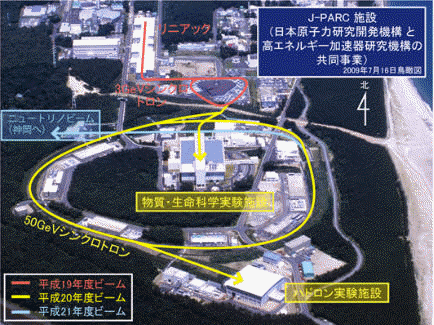 す」 「<日本/T2K実験>が…」支折が言った。「茨城県東海村/<J-PARC>(/大強 度陽子加速器施設・・・高エネルギー加速器研究機構と日本原子力研究開発機構による共同プロジェクト。茨城県の原 子力科学研究所内に位置。リニアック、RCS(Rapid Cycling Synchrotron) 、MR(Main Ring) の3台の加速器からなる。) から発射されたニュートリノを、岐阜県神岡町/<スーパー・カミオカンデ>で…