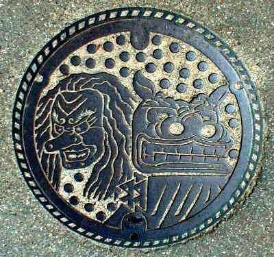 獅子と鬼をデザインにたマンホール蓋 農村集落排水施設 平成10年5月23日 羽黒町黒瀬 |