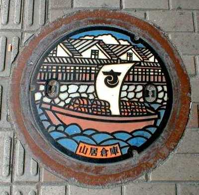 山居倉庫と千石船をイメージした カラーマンホール蓋 平成10年5月23日 酒田駅前 |