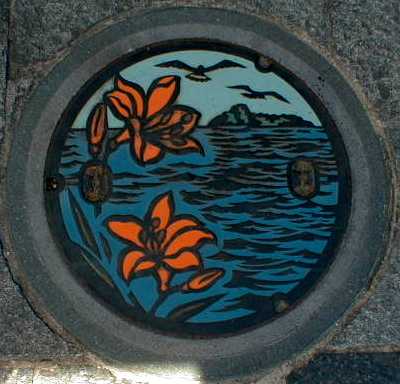 トビシマカンゾウと飛島をデザイン したマンホール蓋 平成10年7月26日 酒田市日吉町 |