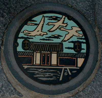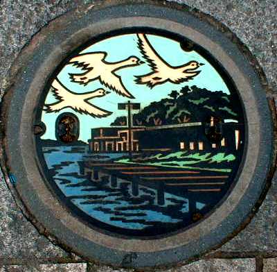 白鳥と城輪柵跡をデザインした マンホール蓋 平成10年7月26日 酒田市日吉町 |