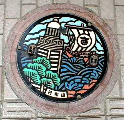日本最古の木造灯台、千石船を イメージしたカラーマンホール蓋 平成10年5月23日 酒田駅前 |