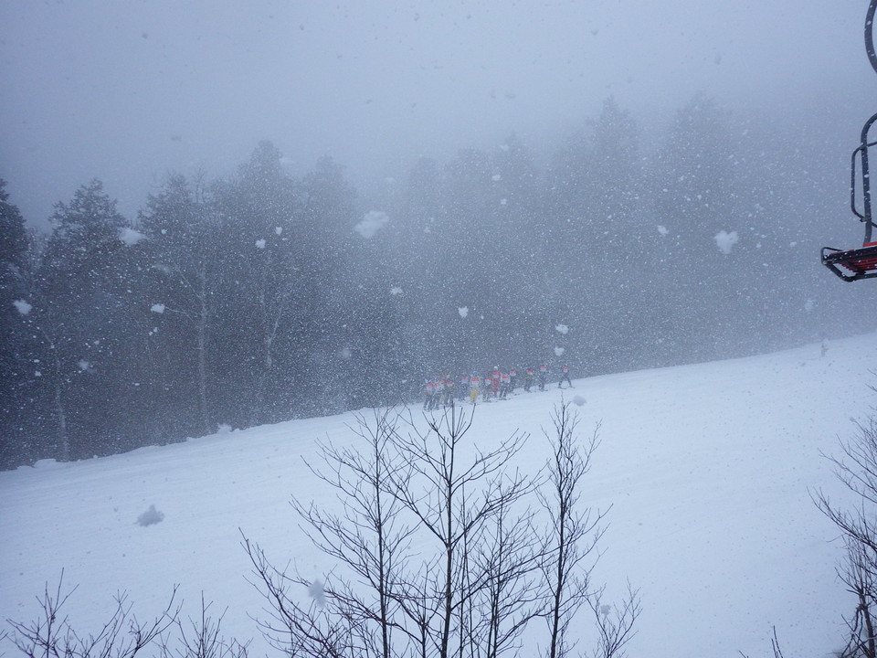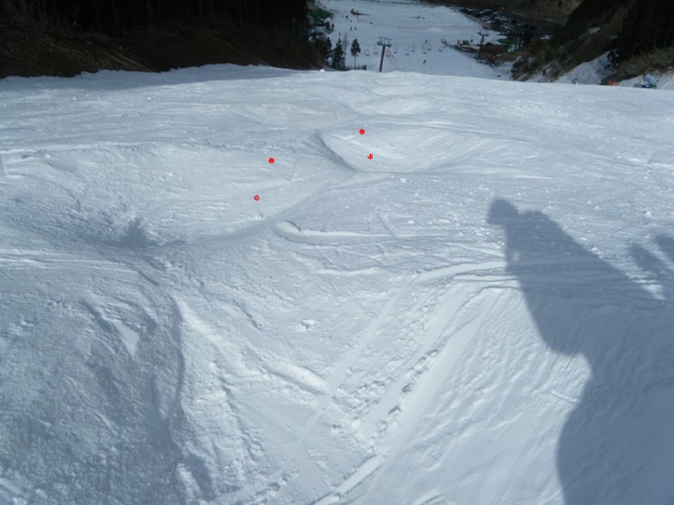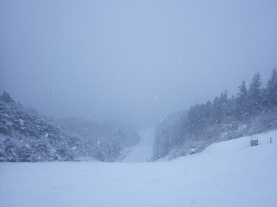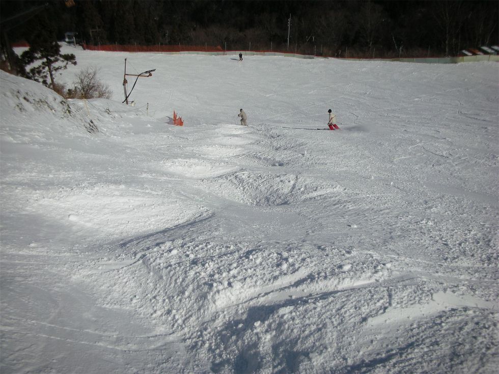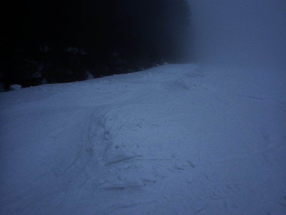 <小田(4)>真っ白で視界不良です。 こんな日でも、予定通り技選の大会が開かれます。 大会が変わればコースの名前も変わって 「モーグルコース」ではなく「不整地小回りコース」になります。 いつものコブですが。 キザミを入れた直後の浅いコブは完走できていたのですが、 技選の大会が終わった後は、深く掘れてしまって もう無理〜 ( ̄〜 ̄;) 今日も一日ありがとうございました。 危険な日です![]() 写真では凸凹が良く見えない |