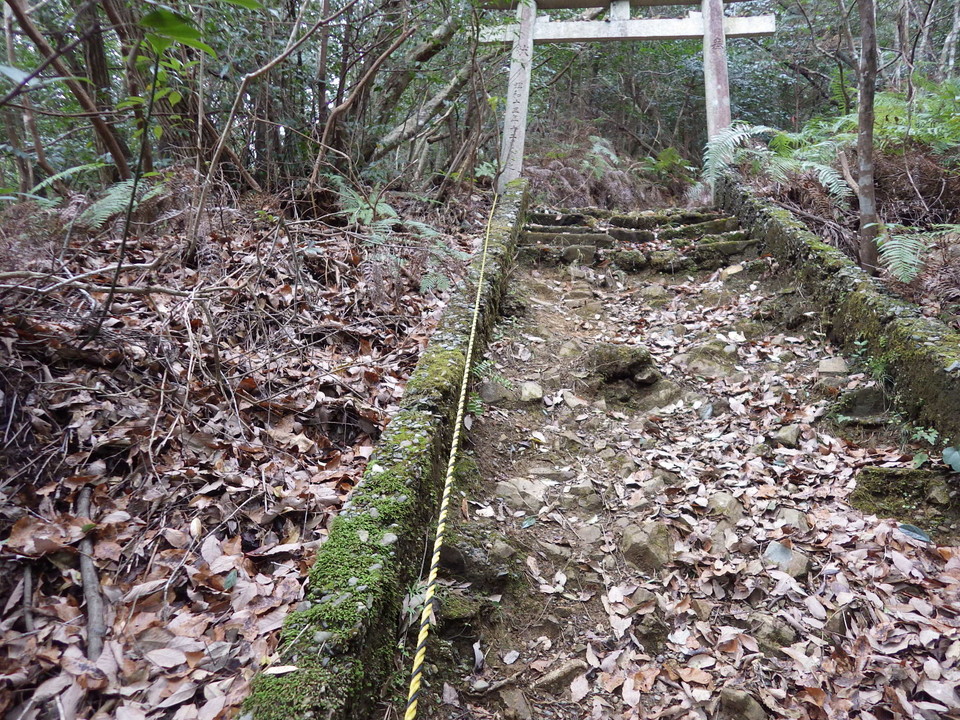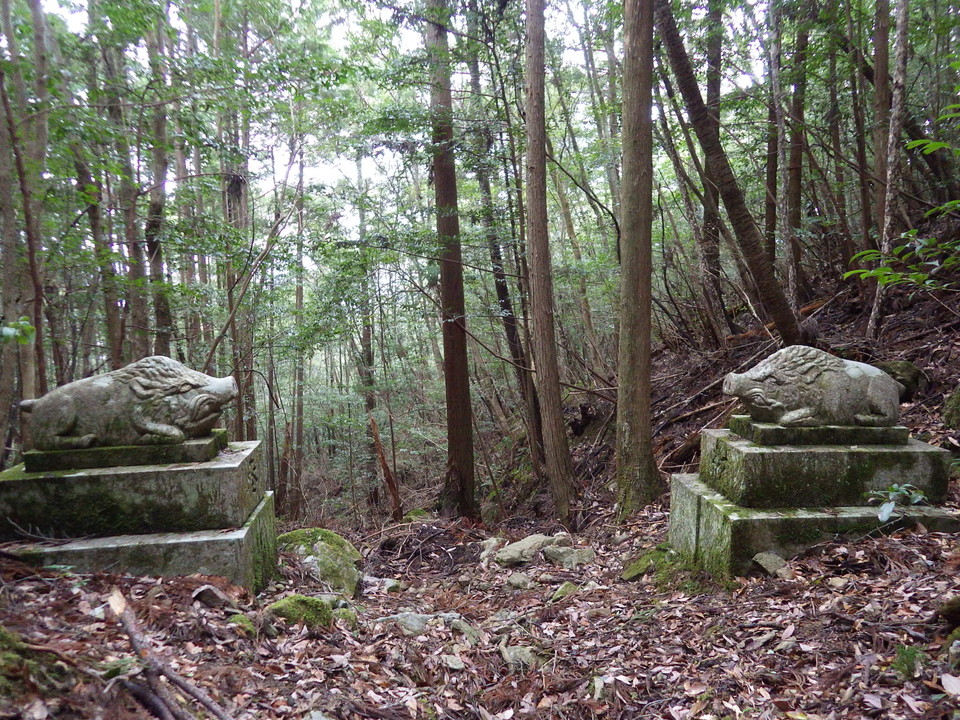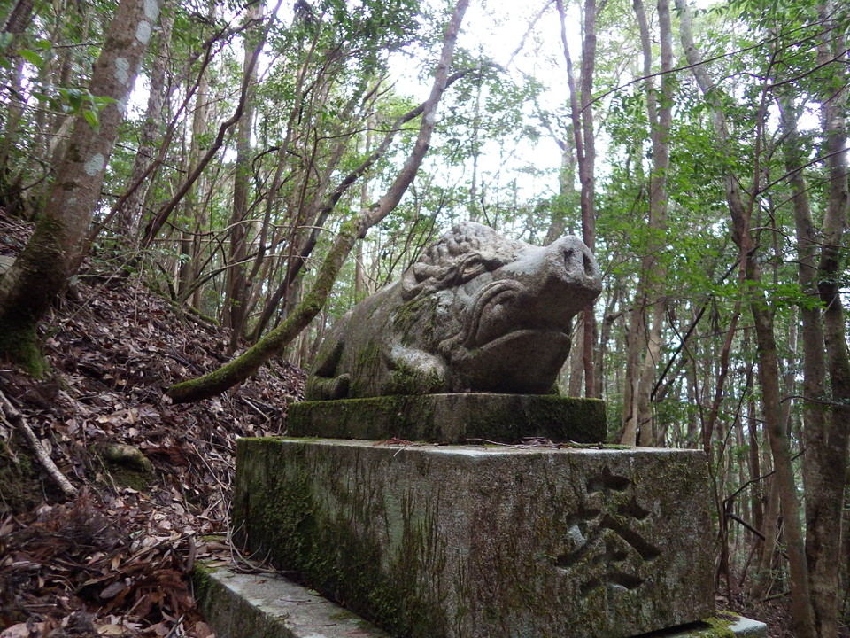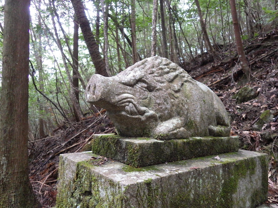 ![]() そういう大変な道なので、迷わないように、ピンクのテープが木に巻き付けて あり、まあまあ安心して登れます。 滑りやすい岩場はロープが懸けてあるのですが、 ロープを引いて登るのもなかなか大変です。(私は右手が不自由なので) 自分の場合、本殿までは休憩少なめで徒歩50分、 梁瀬山の頂上までが70分かかりました。 これが本殿です。 ![]() 古事記、日本書紀に登場する少彦名命(すくなびこなのみこと)は とても体が小さかったそうなので、この大きさで大丈夫なのかな。 狛犬マニアな方もうなる、狛猪 ![]() 昔はこちらに参道があったのかもしれない、と想像できますが、 今は荒れ果てております。道はありません。