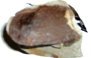 写真 ラグビーボール状のノジュールが三つに割れた状態です。中央部の断面を見て下さい。化石が密集している状態がよくわかります。真中の棒状のものはおそらくアンモナイト「バキュリテス」でしょう。