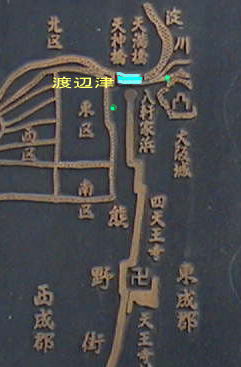 大阪市設置の熊野街道解説石碑の一部。渡辺津など一部表示の挿入は当館によります。