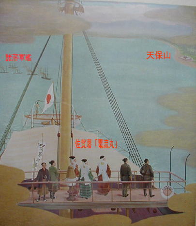 左図は、明治元年3月26日、鳥羽伏見戦の勝利後行われた大坂行幸時に明治天皇が諸藩軍艦を天保山“大坂港”から視察したときの光景です。