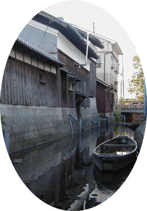 写真左は、大阪府大東市御領の一部です。水路に面した建物と浮かぶ舟(三枚板)。水郷の景観を具体的にとらえることができるでしょう。このうちの三枚板というひとつのファクターを保存することは、この景観を保持することに比べたら、はるかに容易といえるでしょう。