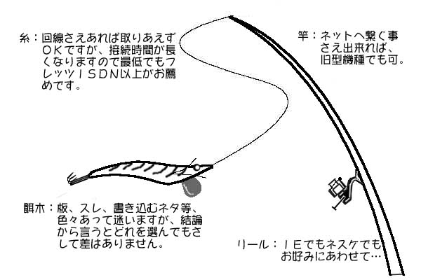 じゃあいよいよ釣り方の説明だよ。まず道具立ては次の通り。→●
